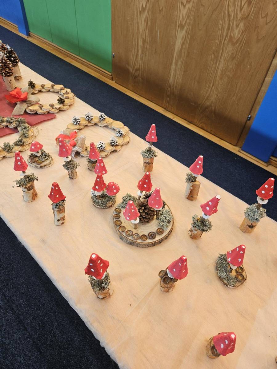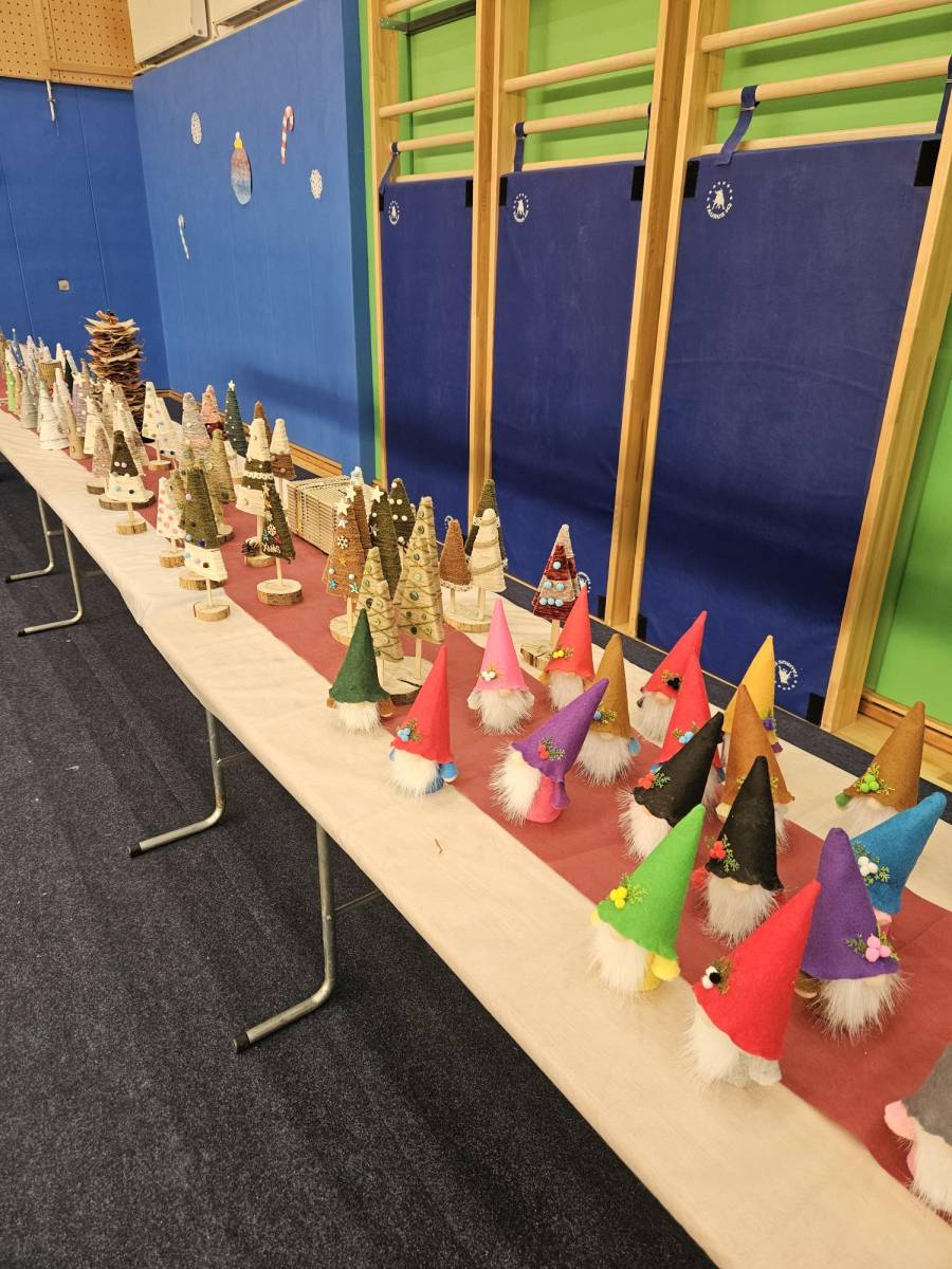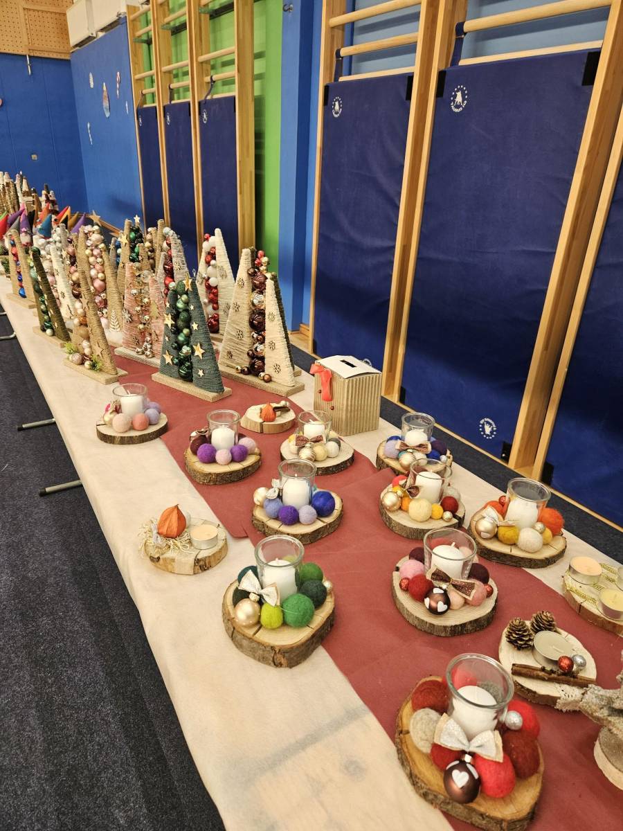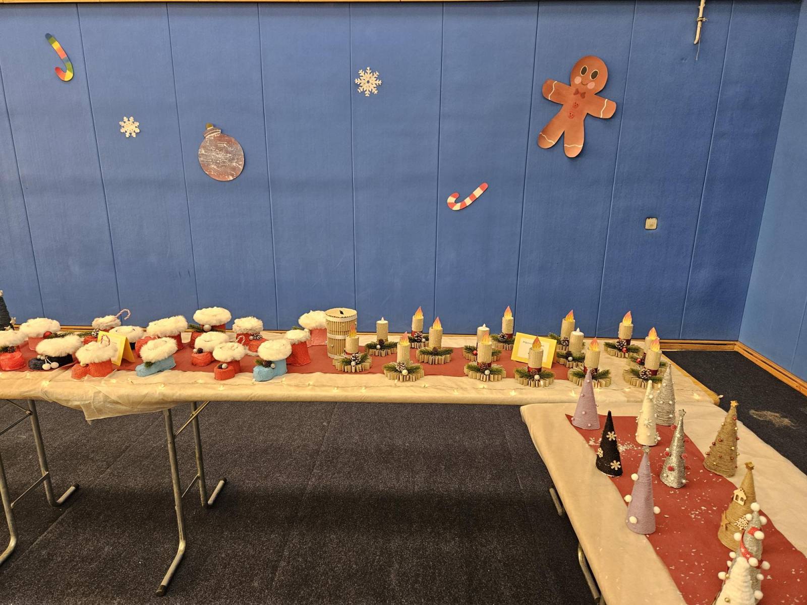 Po končanem programu so se obiskovalci lahko sprehodili med bogato obloženimi stojnicami. Na njih so jih pričakali praznični izdelki, ki so nastali izpod spretnih rok otrok med delavnicami ob tehniškem dnevu. Stojnice so žarele v soju luči in vabile z bogato izbiro božičnih okraskov in adventnih venčkov.
