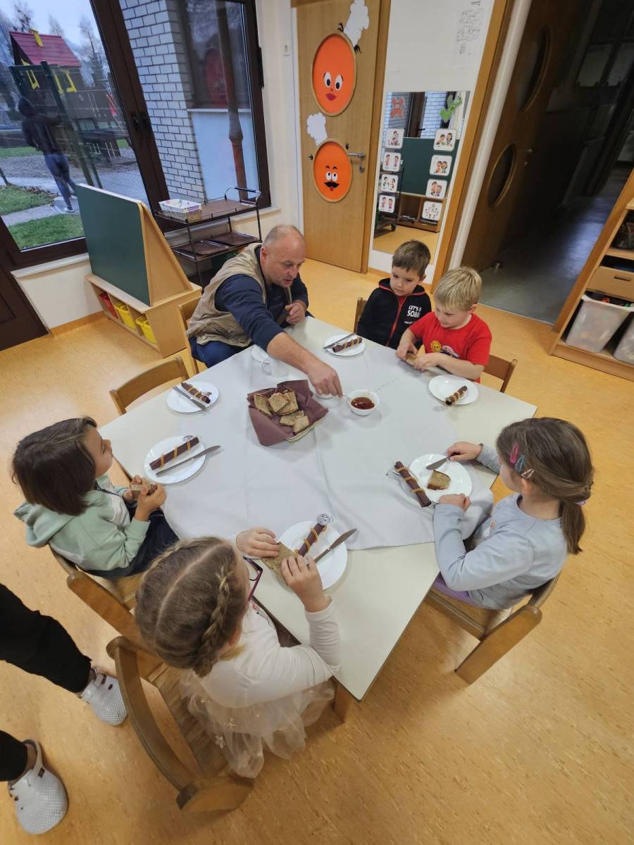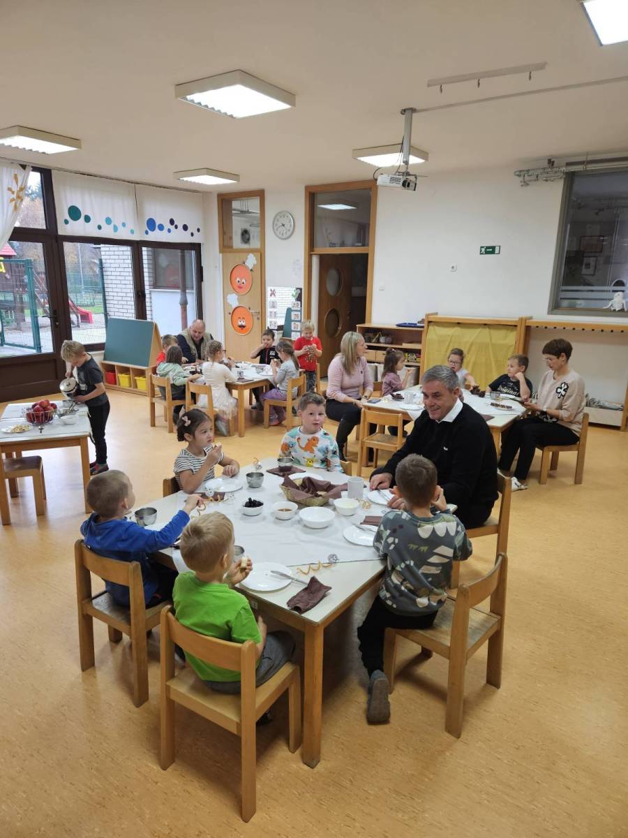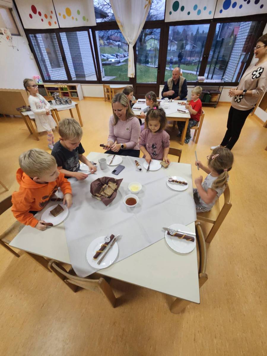 Tradicionalni slovenski zajtrk je potekal v petek, 21. 11. 2025. Za zajtrk so nam kuharice pripravile domač kruh, maslo, med, jabolko in mleko. Na zajtrku so se nam pridružili župan občine Vuzenica, gospod Franjo Golob, ravnateljica dr. Mojca Hrastelj Brelih, vodja vrtca gospa Andreja Kuhar in čebelar gospod Domen Žvikart. Otroci so bili veseli obiska, in verjamemo, da jim bo ta zajtrk ostal v lepem spominu.
